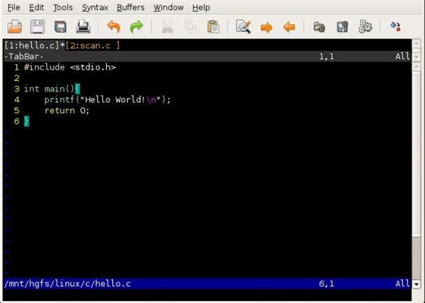 在同時開啓編輯多個檔案時,就會在編輯的上方多出一個TabBar的區域,顯示目前開啓的全部檔案和檔案編號,要切換不同的檔案就用<Alt>+<檔案編號>就可以了,如果是用gvim的話還可以用<Ctrl>+<Tab>或<Ctrl>+<Shift>+<Tab>切換到下一個或前一個檔案。真是個方便的功能呀