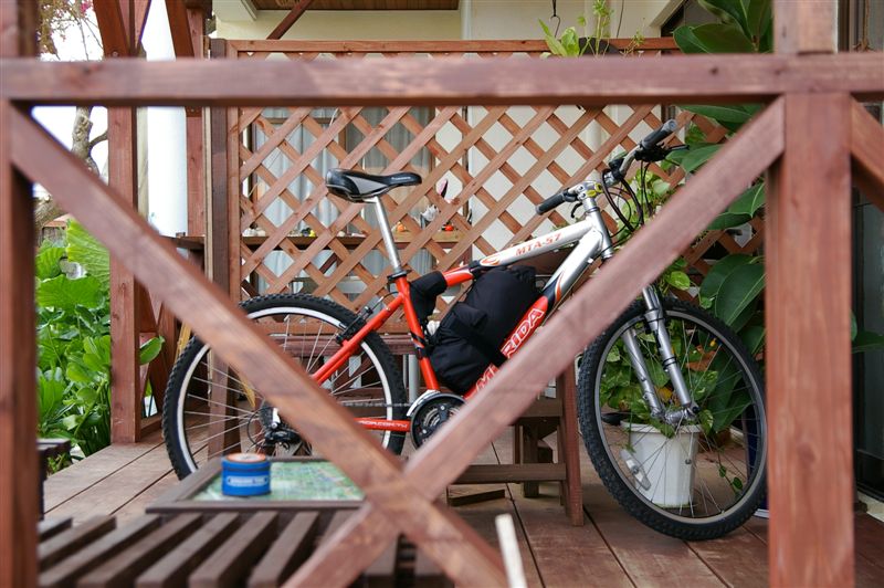 以不到10 km/hr的速度前進,騎到瀨底島的高點時還沒找到要去民宿的路,如果繼續往前找(滑到島的另一端),萬一沒找到,就表示還要再爬坡一次騎回來。真的是沒體力再這樣玩一次了,找了間有營業的義大利餐廳(唯一有營業的一間)問路,我的日文很破,老闆的英文不行,我們就這樣問起路來了。神奇的是我竟然還聽得懂,謝過老闆後依老闆的指示很幸運的一下就找到民宿了(老天爺今天給我的考驗結束了嗎?過關...ya