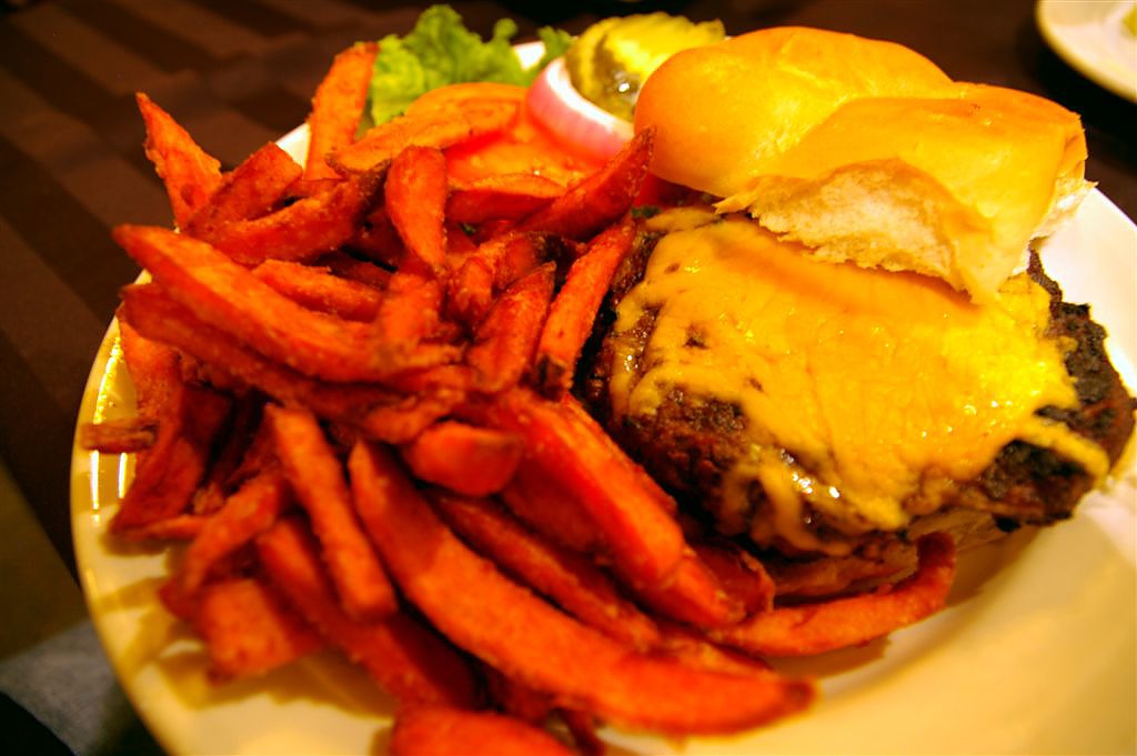 最後,只好使出下下策,希望旅館的餐廳還有營業。第一晚就來個道地美國食物吧!