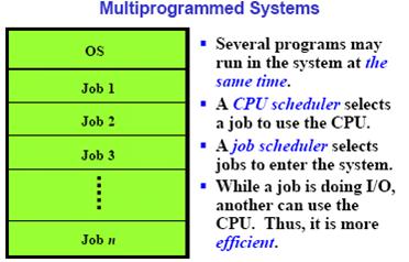 - Multiprogramming is the first instance where the operating system must make decisions for the users (So there's a CPU scheduler).