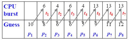 - Let tn be the length of the nth CPU burst and pn+1 be the prediction of the next CPU burst