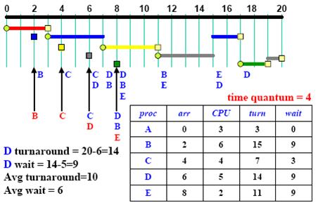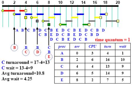 - When the CPU is free, the scheduler picks the first and lets it run one time quantum.