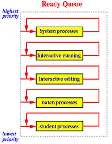 - A process P can run only if all queues above the queue that contains P are empty.