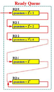 - Processes in queue i have time quantum 2i.