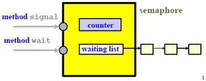 • A semaphore is an object that consists of a counter, a waiting list of processes and two methods (e.g., functions): signal and wait.