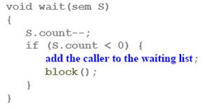 • To overcome the need for busy waiting, the process can block itself. The block operation places a process into a waiting queue associated with the semaphore, and the state of the process is switched to the waiting state.