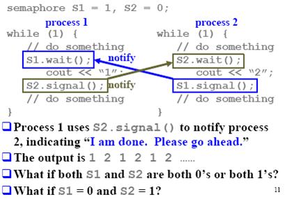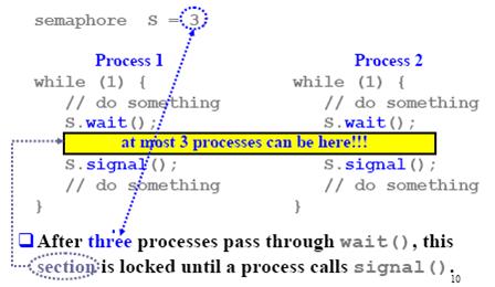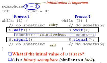 • A semaphore S is an integer variable that, apart from initialization, is accessed only through two standard atomic operations: wait and signal.