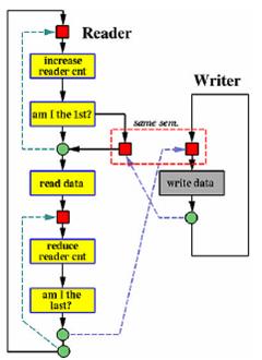 • Two groups of processes, readers and writers, are accessing a shared resource by the following rules: