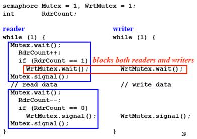 • This reader-priority version has a problem: bounded waiting condition may be violated if readers keep coming, causing the waiting writers no chance to write.