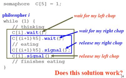 • A philosopher calls wait () before picks up a chopstick and calls signal () to release it.