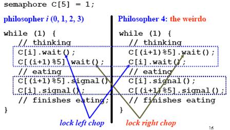 • An odd philosopher picks up first her left chopstick and then her right chopstick, whereas an even philosopher picks up her right chopstick and then her left chopstick.