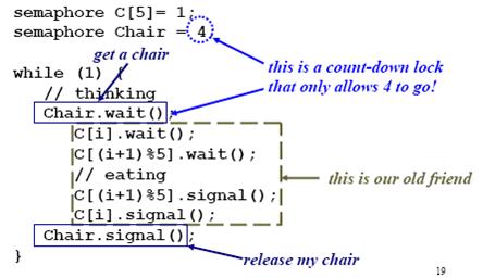 • Count-down lock: keep in mind that semaphores have a counter, example: Dining Philosophers with 5 philosophers and 4 chairs.