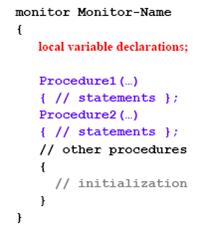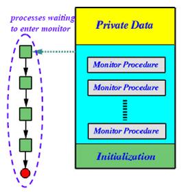 • When a process calls a monitor procedure and enters the monitor successfully, it is the only process executing in the monitor.