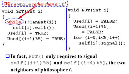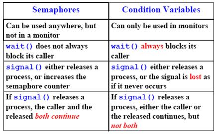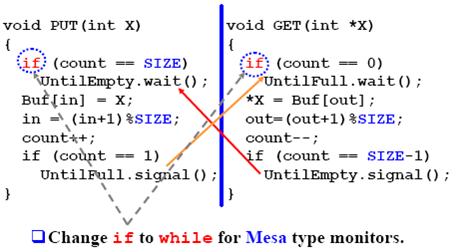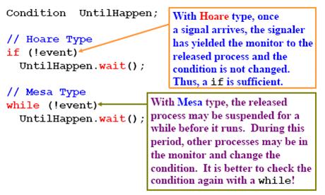 • With Mesa type monitors, the condition variable may be evaluated multiple times. However, incorrect signals will do less harm because every process checks its own condition variable.
