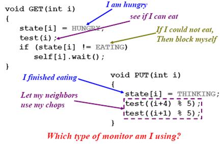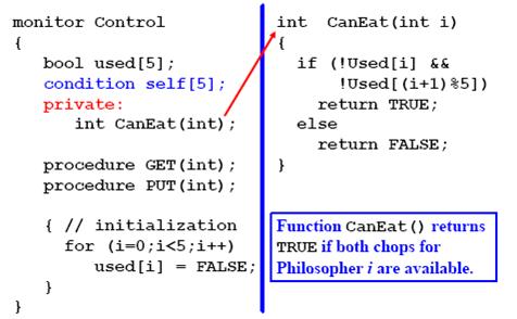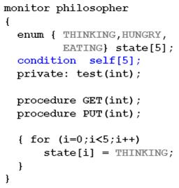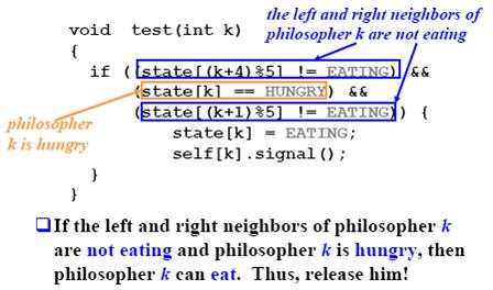 • We use an array state [] to keep track the state of a philosopher. Thus, philosopher i can eat (i.e., state [i] = EATING) only if his neighbors are not eating (i.e., state [(i+4) %5] and state [(i+1) %5] are not EATING).