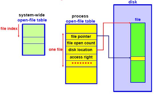 - Open-file table: The OS keeps a small table containing information about all open files.