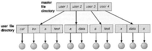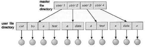 - Each user has his/her user file directory (user file directory, UFD). The system’s master file directory (MFD) is searched for the user directory when a user job starts.