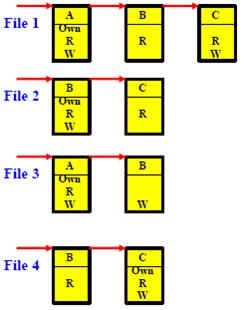 - Each file and directory is associated with an access matrix specifying the user name and the types of permitted access.